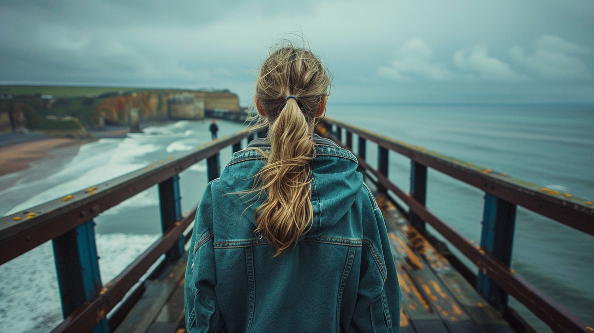 Woman wearing a green denim jacket. Denim drying tip: Gently squeeze water out, air dry away from sunlight. Autumn season. African American female. Herne Bay Pier, Herne Bay, UK background.