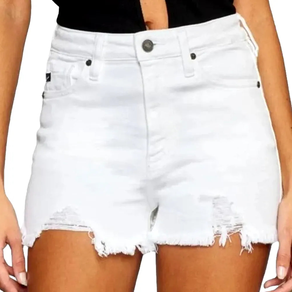 Our Grunge Damaged Denim Shorts are the perfect embodiment of effortless cool and vibe. With their unique combination of grunge, straight, distressed, white, high-waist, zipper & buttons closure, and stretchy features, these shorts are a statement piece that will elevate any outfit.