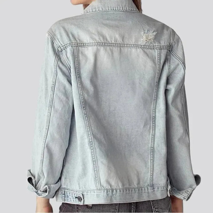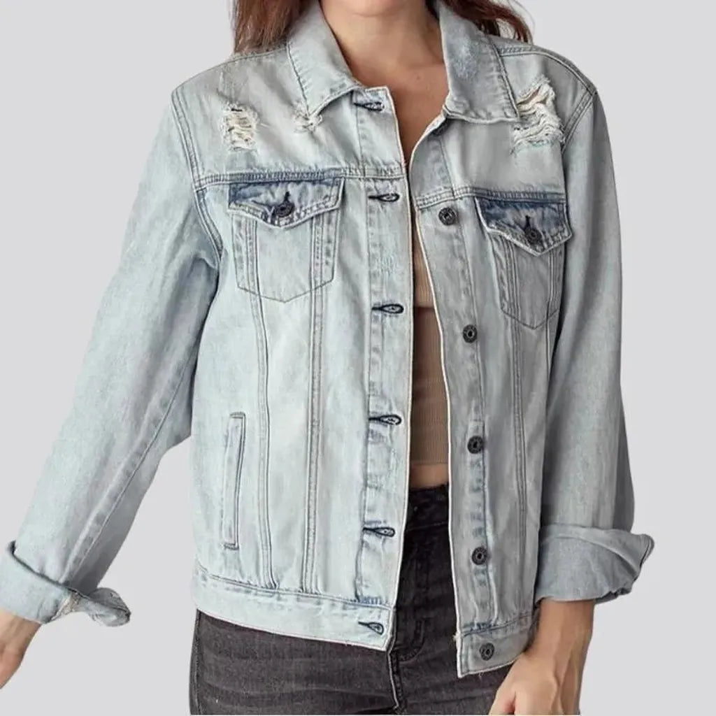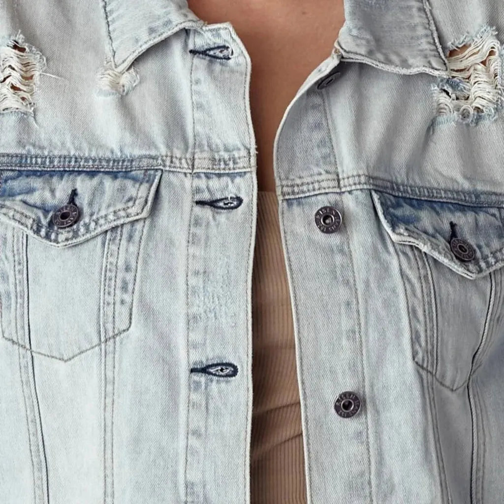 Elevate your underground mode with our damaged denim jacket from the 2024 Summer Collection. The light-wash and regular silhouette exude a retro vibe, while the buttoned closure adds a touch of vogue sophistication. This jacket is a must-have for any vogue-forward woman looking to make a statement.