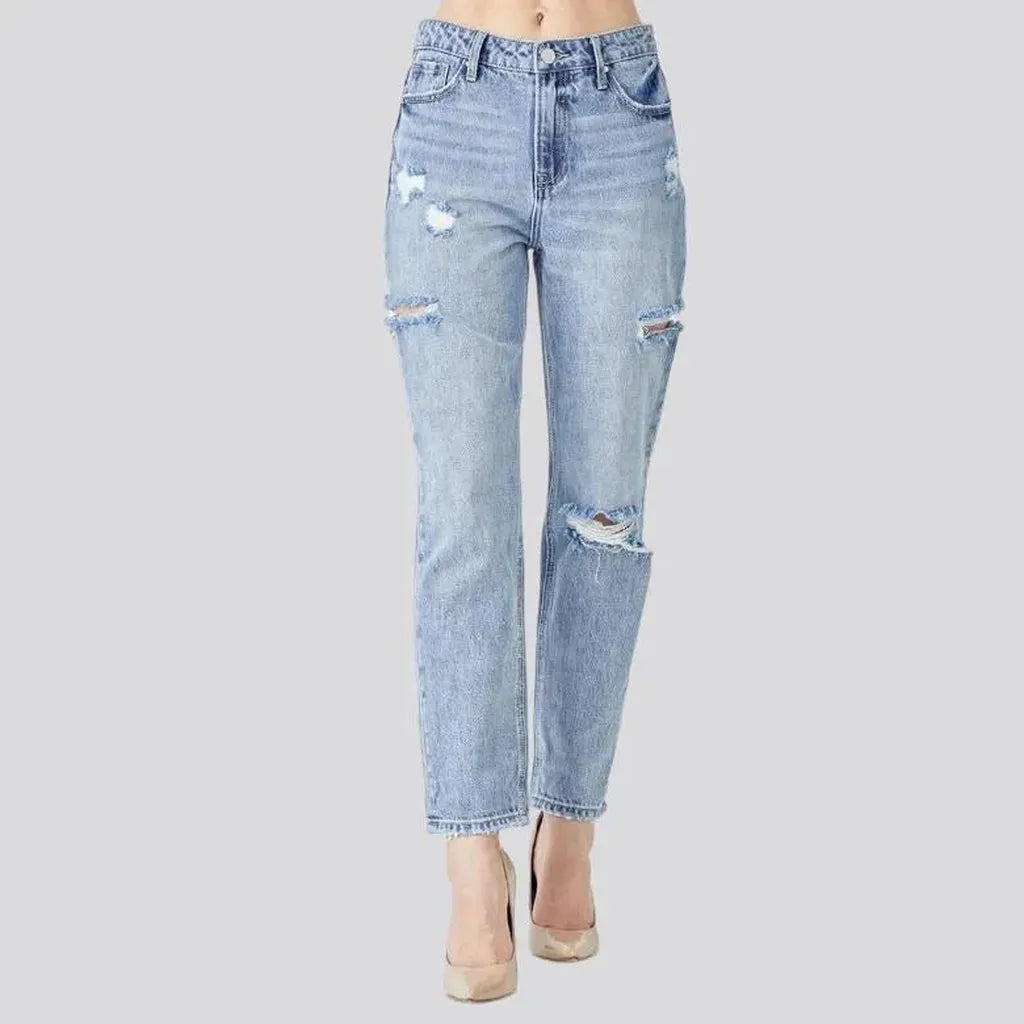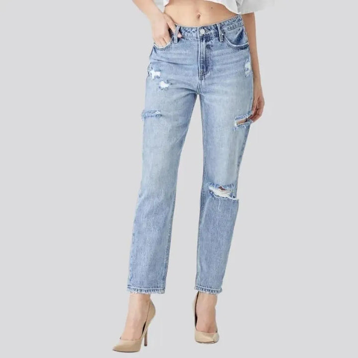 Elevate your summer wardrobe with our 2024 Summer Collection's mom distressed jeans for women, featuring a grunge style that exudes undeniable coolness. Made with a light-wash denim and whiskered detailing, these ankle-length jeans are the perfect combination of vintage and modern. The high-waist design flatters your figure while the zipper and button closure adds a touch of functionality to this edgy piece.