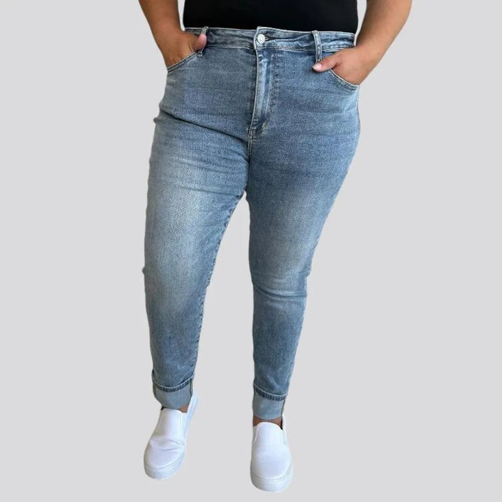 Introducing our newest addition to the 2024 Summer Collection the must-have for plus-size women, the sanded jeans in a casual, stonewashed, slim shape style!