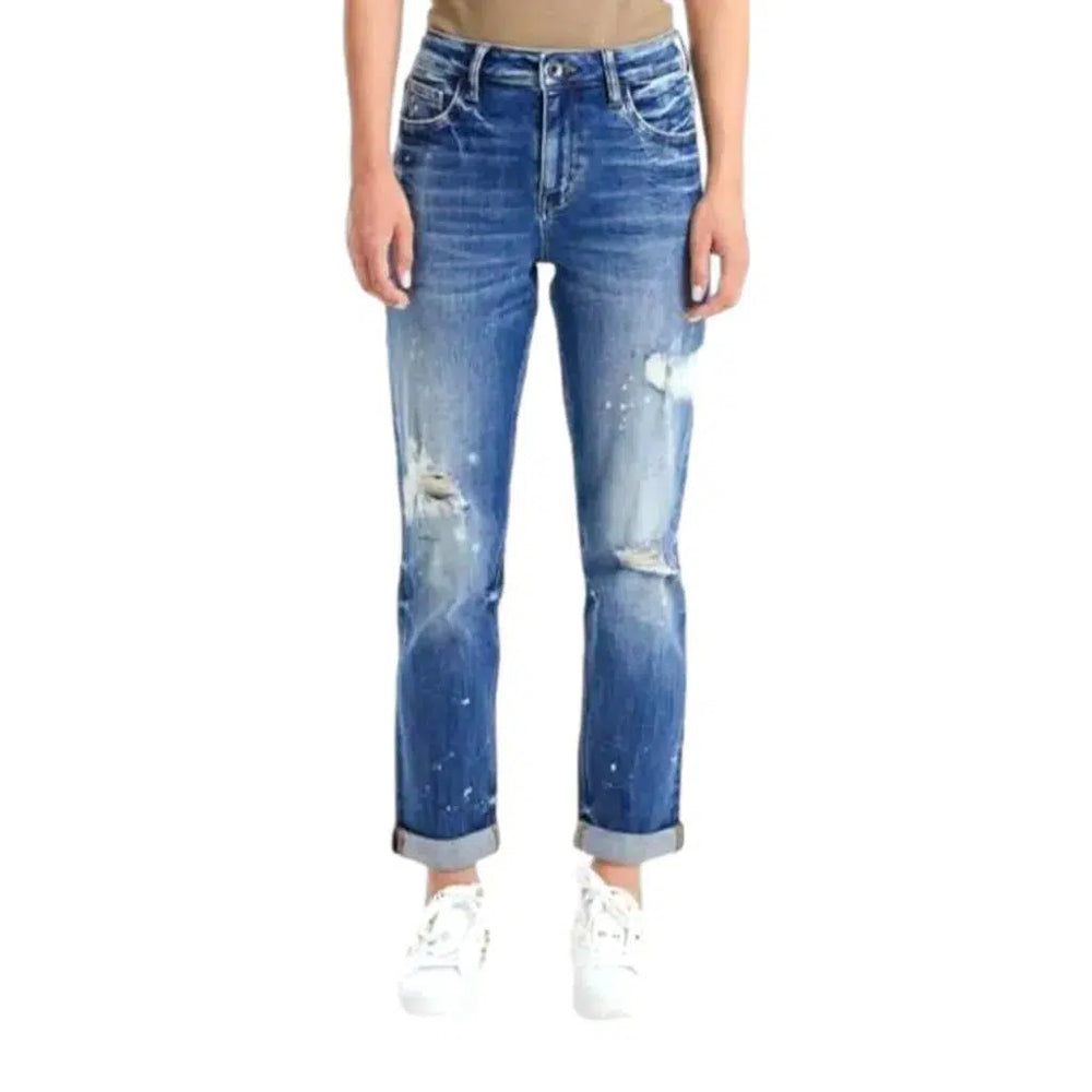 Introducing our highly-stretchy distressed jeans for ladies from our 2024 Spring Collection. Get ready to rock the grunge style with these slim-fit jeans that feature sanded and whiskered accents for a perfectly distressed look.