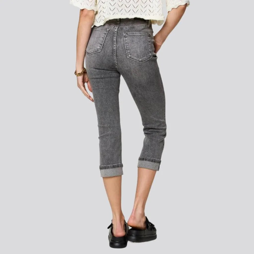 Elevate your street style with our folded-hem women's aged jeans from the 2024 Summer Collection. These skinny jeans feature a high-rise design and a grey smoothed wash for a retro look. The furrowed details add a touch of character, while the plaited hem adds a modern twist. Crafted from stretchy fabric, these jeans offer both comfort and vibe. The zipper and button closure ensures a snug form while adding to the aesthetic charm of the jeans.