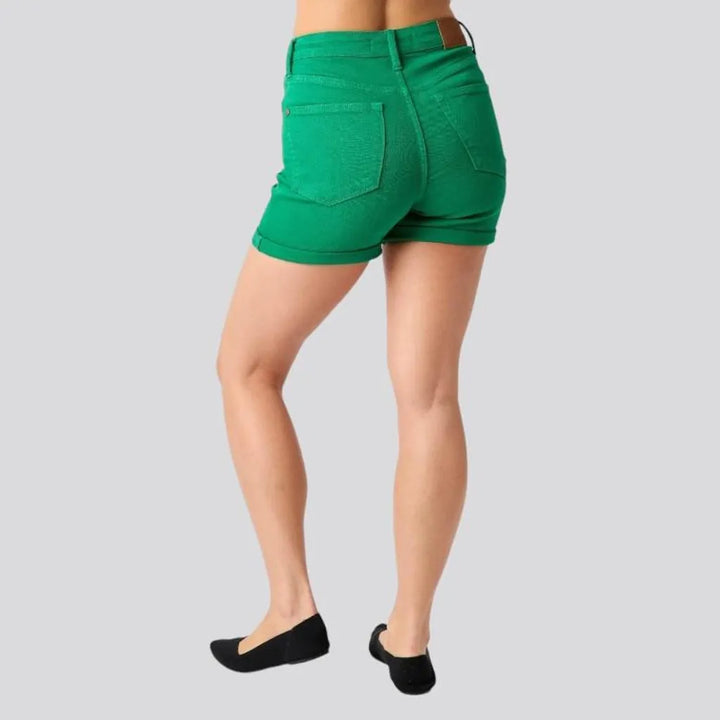 Introducing our stunning Y2K flair green jeans shorts for ladies from our 2024 Summer Collection. These high-waisted shorts feature a zipper and button closure, and are made with a stretchy fabric for ultimate comfort. With a sleek and shaped fit, these shorts are perfect for any summer occasion.