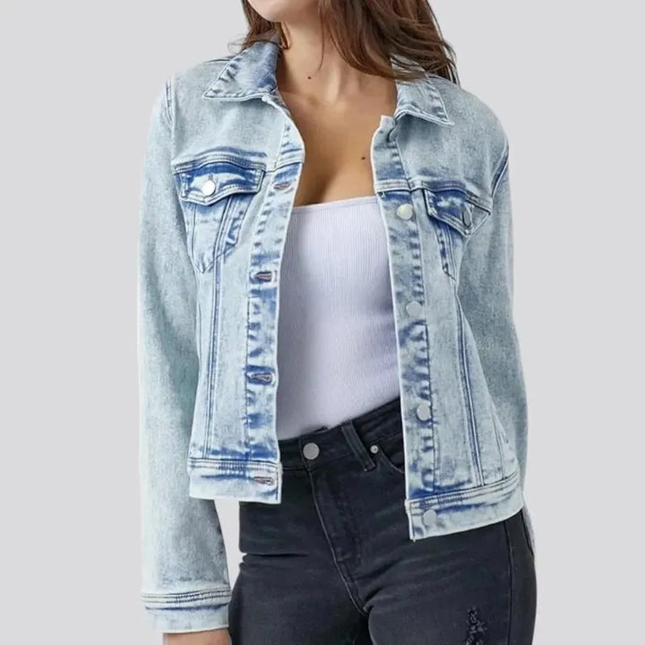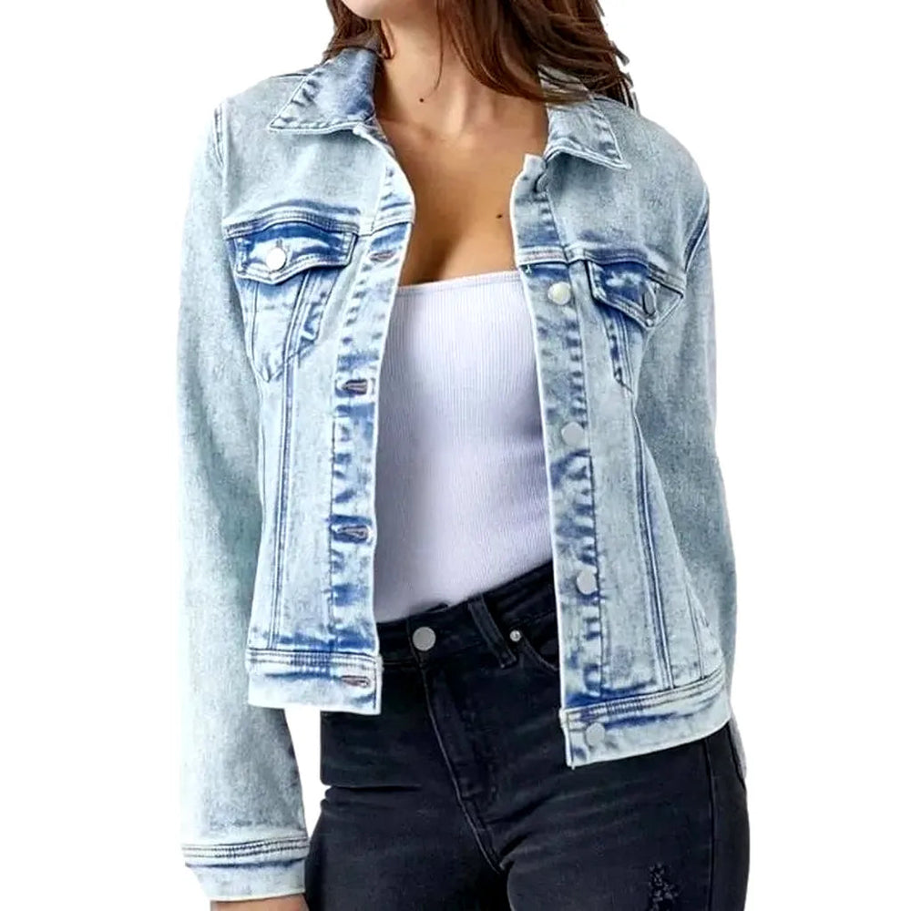 Crafted with a perfect blend of vintage charm and modern flair, this denim jacket is a timeless piece that will elevate any outfit. The light-wash color adds a touch of femininity while the slim fit and stretchy fabric ensure a flattering silhouette for all body types. The buttoned closure adds a classic touch while the overall design screams street style.